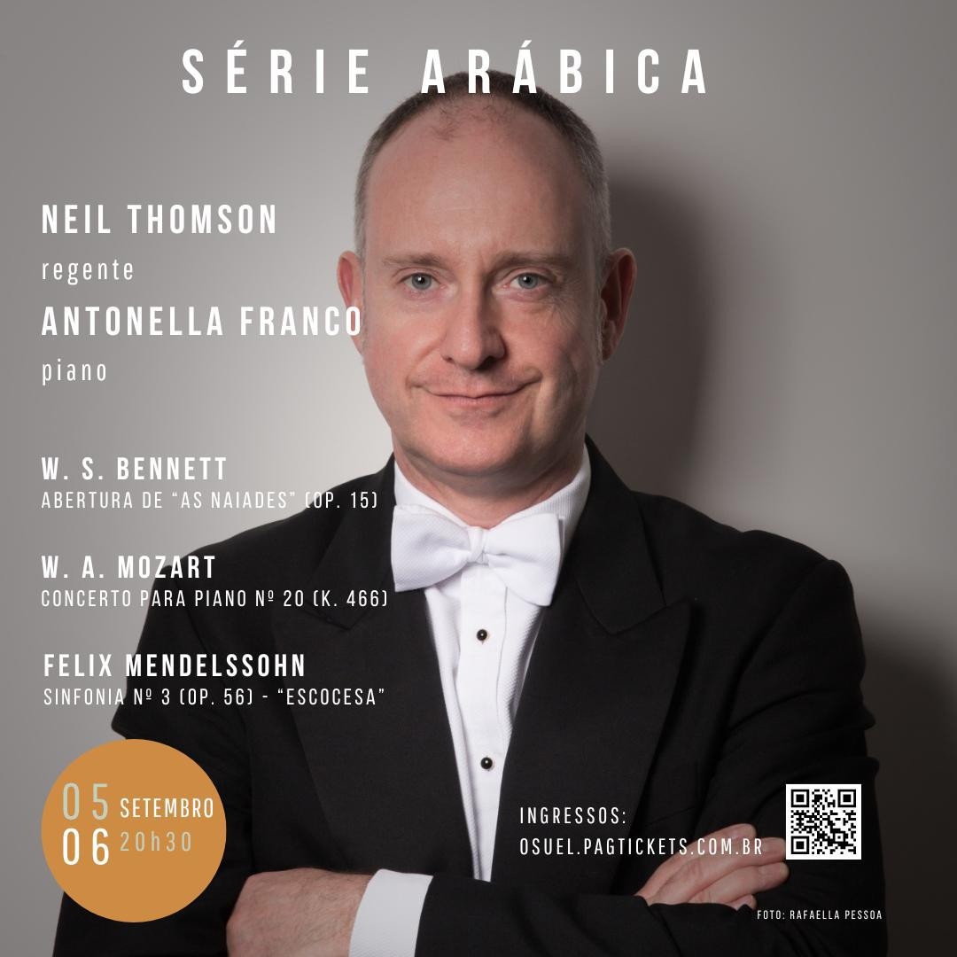O programa inclui três obras de destaque. A Abertura "As Náiades", Op. 15, de William S. Bennett, encantará com sua orquestração delicada e clara, inspirada na viagem do compositor pelo Reno e na influência de Mendelssohn. Composta em 1836, a peça reflete a elegância e a vivacidade das aberturas românticas da época. O Concerto para Piano No. 20 em Ré menor, K. 466, de Wolfgang Amadeus Mozart, é uma obra-prima de caráter sombrio e emocionalmente intenso. Composta em 1785, esta peça destaca-se pelo seu diálogo intenso entre o piano e a orquestra, oferecendo um contraste dramático e virtuoso, admirado até por Beethoven. Finalmente, a Sinfonia No. 3 em Lá menor, Op. 56, "Escocesa", de Felix Mendelssohn, completa o programa. Inspirada por uma viagem à Escócia em 1829, esta sinfonia é notável por sua estrutura contínua e por sua combinação única de atmosferas evocativas e contrastantes, desde o movimento sombrio e agitado até o final majestoso e triunfante.
